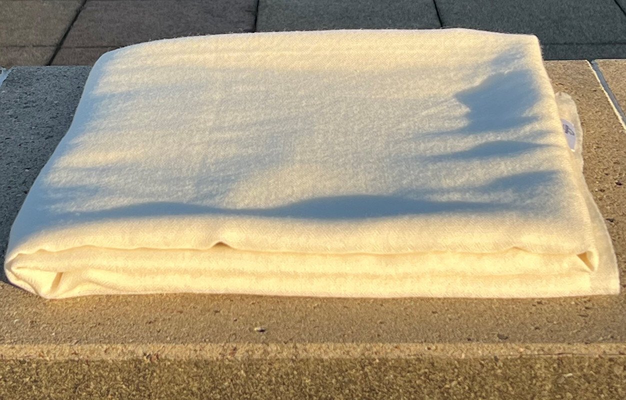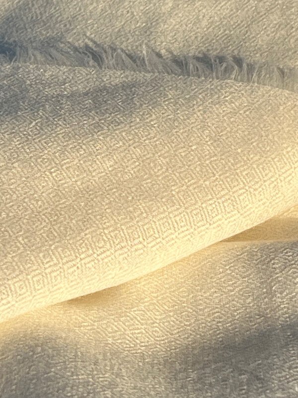 Wir beziehen die Wolle-Seiden-Decken direkt von einem kleinen Unternehmen aus der indischen Region Kaschmir. Dort werden seit über 50 Jahren Schals und Decken von erfahrenen Webern an einfachen Webstühlen hergestellt. Die Decken werden speziell für uns gefertigt. Sie sind 140x280cm groß, im hochwertigen Diamond-Weave (Webart). Sie sind beige und nicht gefärbt.