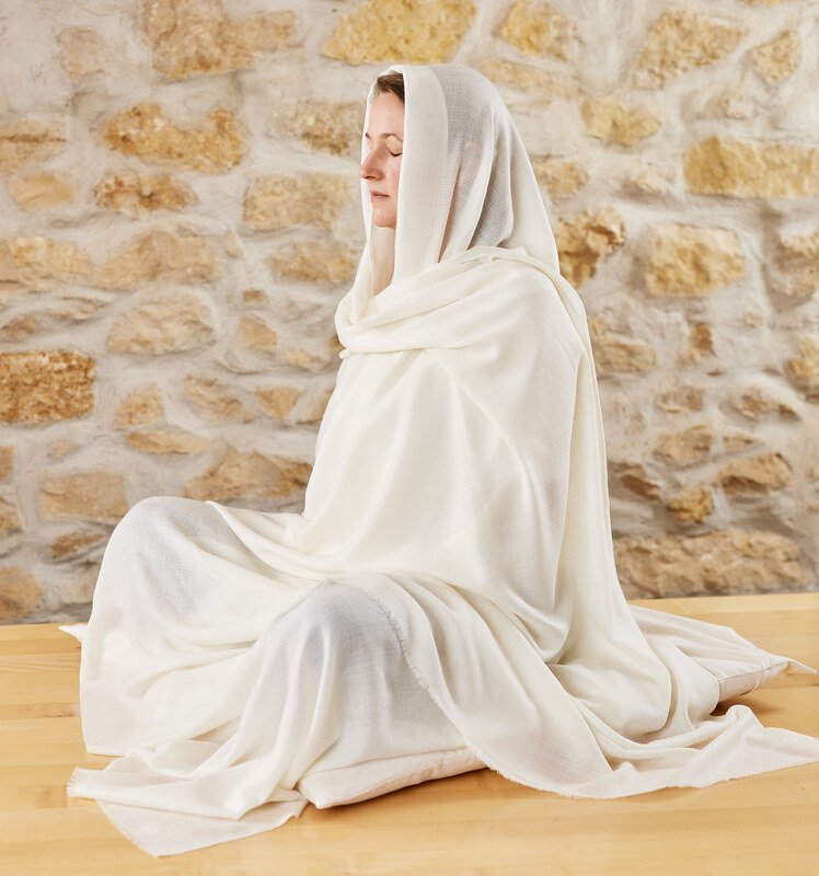 Die Decke ist wunderbar leicht und temperaturausgleichend. Sie ist vielseitig einsetzbar, wurde jedoch besonders entwickelt als Meditationsdecke, da sie so groß ist, dass man sich im Schneider- oder Lotussitz gut bedecken kann – einschließlich den Kopf und auch großzügig die Knie. Für manche ist es die beste Meditationsdecke, die sie je hatten.