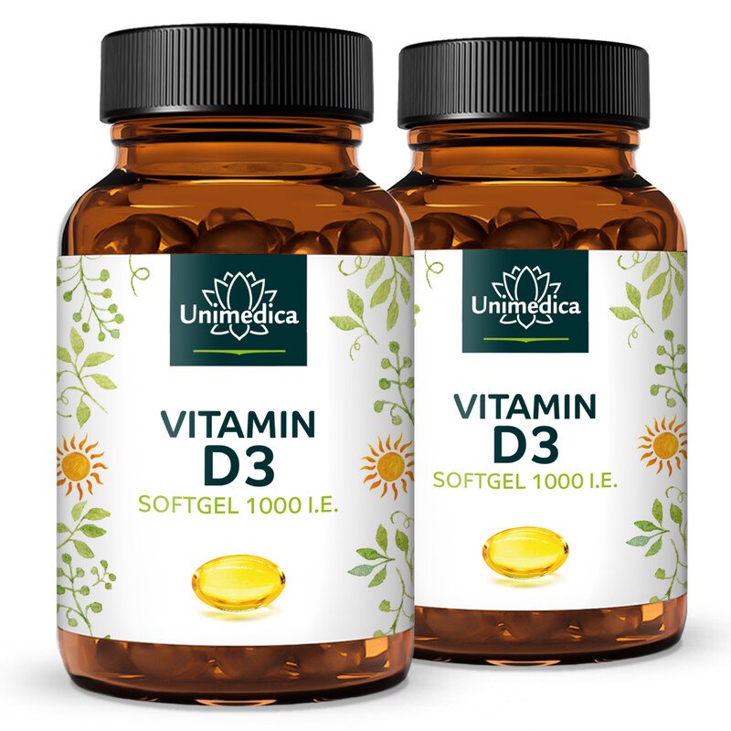 Die Vitamin D3-Softgelkapseln von Unimedica versorgen den Körper täglich bequem mit dem lebenswichtigen Vitamin D (Cholecalciferol) - unabhängig von Sonnenschein und Nährstoffgehalt der Lebensmittel. Mit 1000 I.E. (Internationale Einheiten) Vitamin D3 pro Tagesdosis ist eine gute Grundversorgung gesichert. Diese Dosis entspricht 500 % der empfohlenen Menge pro Tag, um die Knochen und Zähne sowie eine normale Muskelfunktion zu erhalten, das Immunsystem zu unterstützen, die Calcium-Aufnahme zu fördern und den Calciumspiegel im Blut in Balance zu halten, was für die Knochensubstanz wesentlich ist.