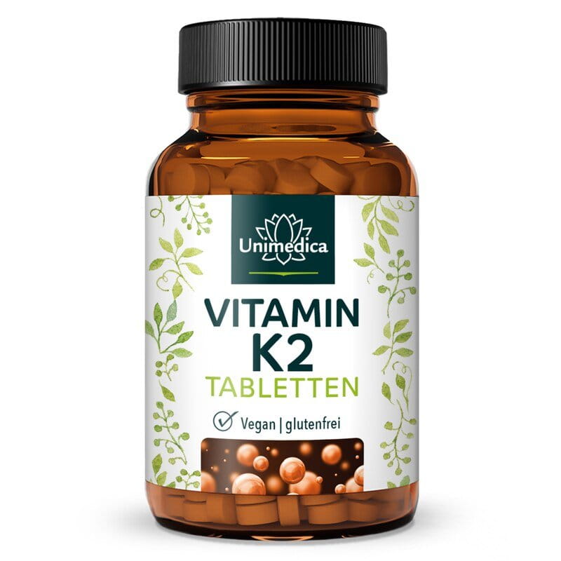 Vitamin K2 MK7-All-trans Tabletten von Unimedica wurden entwickelt, um eine normale Blutgerinnung und den Erhalt normaler Knochen zu unterstützen. Die Tab-letten sind mit 200 µg K2 MK7-All-trans pro Tagesdosis (1 Tablette) hochdosiert. Die „trans-Form“ des Vitamin K2 (K2 MK7-All-trans) kann vom Körper gut verwertet werden. Da Vitamin K2 fettlöslich ist, sollten die Vitamin K2 MK7-All-trans Tabletten von Unimedica stets in Kombination mit gesunden Fetten und Ölen eingenommen werden.