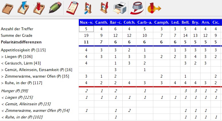 Bei der Polaritätsanalyse ist Nux vomica klar führend das erste Mittel. Die nachfolgenden Mittel sind alle keine häufigen Grippemittel. Camphora an 6. Stelle hat zwar das starke Frösteln zu Beginn, deckt aber nur 3 ihrer gennannten Symptome.